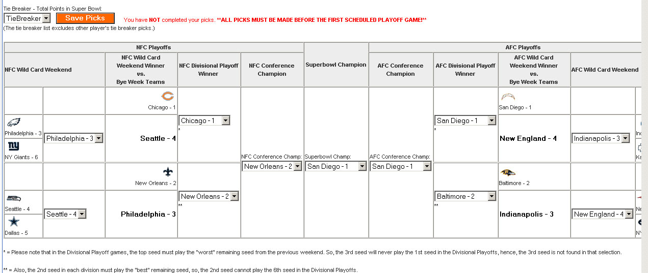 The catch is that all picks, including the superbowl, must be made before the kickoff of the first wildcard game. That is the essence of a bracket style pool.
